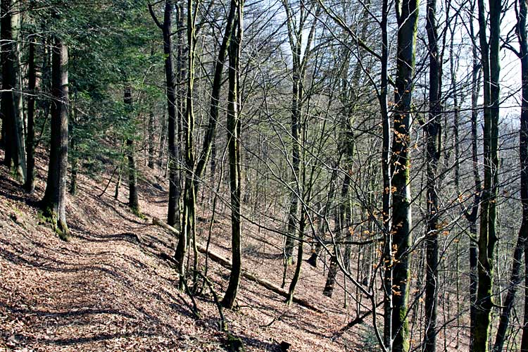 We wandelen via een bospad omhoog naar de uitkijktoren bij Bouillon