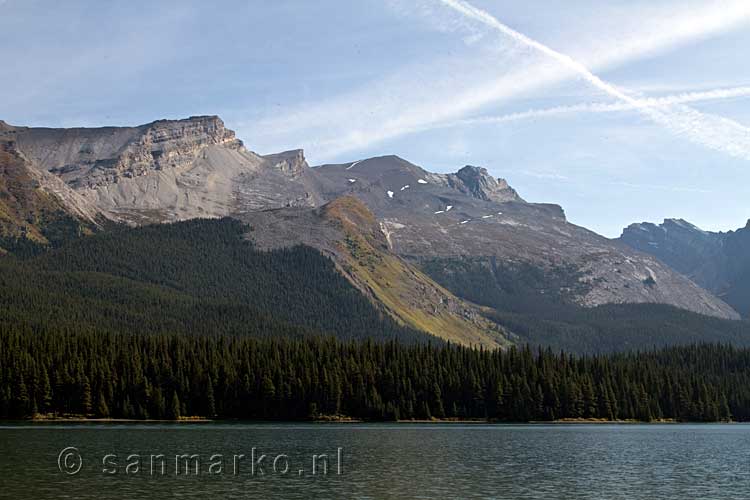 Een mooi uitzicht over de bergen rondom Maligne Lake bij Jasper NP