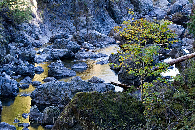 De zon zorgt voor een gouden gloei op het water bij de Sooke Potholes bij Sooke op Vancouver Island in Canada