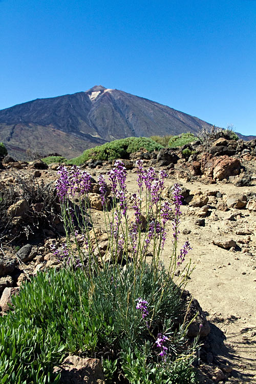 Vanaf het wandelpad El Teide met een soort lavendel op de voorgrond in Las Cañadas op Tenerife op de Canarische Eilanden in Spanje