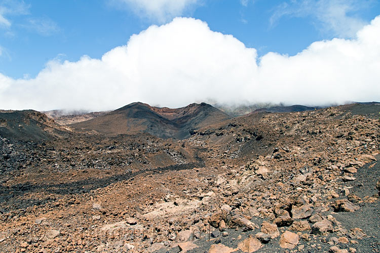 Vanaf het wandelpad uitzicht op de Las Cañadas en El Teide achter de wolken op Tenerife op de Canarische Eilanden in Spanje