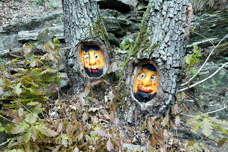 Grappige gezichten in de bomen langs het wandelpad van Teufelsloch terug naar Altenburg in de Eifel in Duitsland