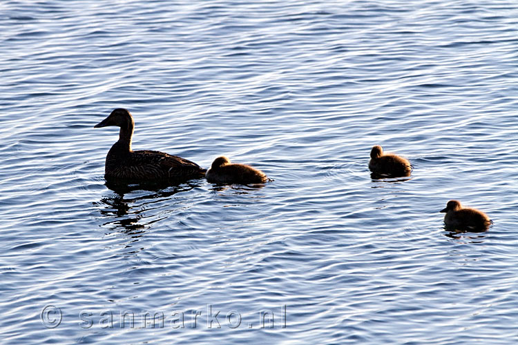 Moeder eend met haar jongen in de haven van Stykkishólmur op Snæfellsnes