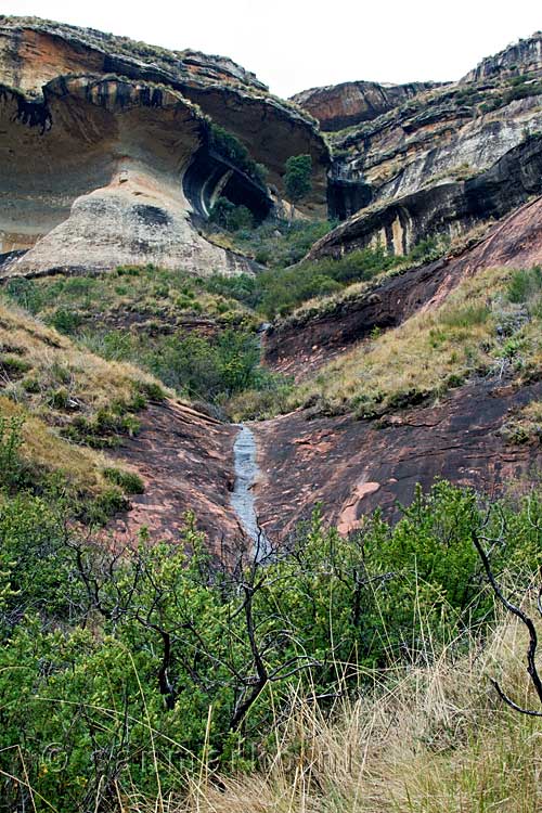 Uitgesleten rotsen met een kleine waterval tijdens de wandeling naar Echo Ravine in Golden Gate Highland National Park in Zuid-Afrika