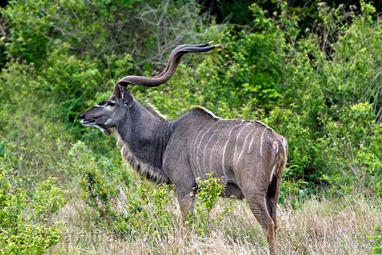 Een mooie grote koedoe in de struiken in iSimangaliso Wetland Park bij Saint Lucia in Zuid-Afrika